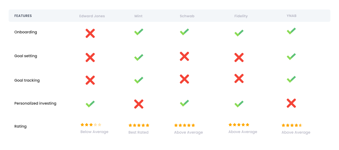While apps like Mint, YNAB all have excellent onboarding and goal tracking, Edward Jones still has the advantage of having a customer base with accounts and money already committed. Building onboarding and goal tracking experiences can lead to better conversions and new customers in an easier way.